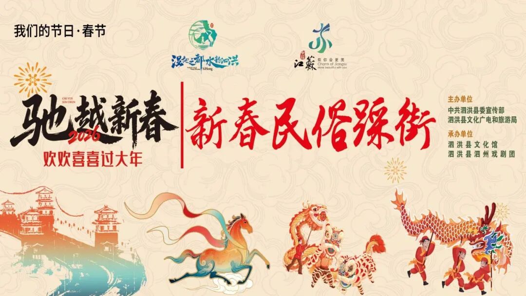 “龙马精神贺新岁民俗踩街迎福来”2026新春民俗踩街活动,于2月19日(正月初三)圆满举办。活动以城区中轴线泗州大街巡游+传统老牌商圈步行街展演的形式,集结数百名演职人员,将非遗民俗与新春福气送到泗洪街头巷尾,为全县人民奉上了一场沉浸式、多元化的新春文化盛宴,让群众在热热闹闹的民俗狂欢中感受地道泗洪年味儿。
