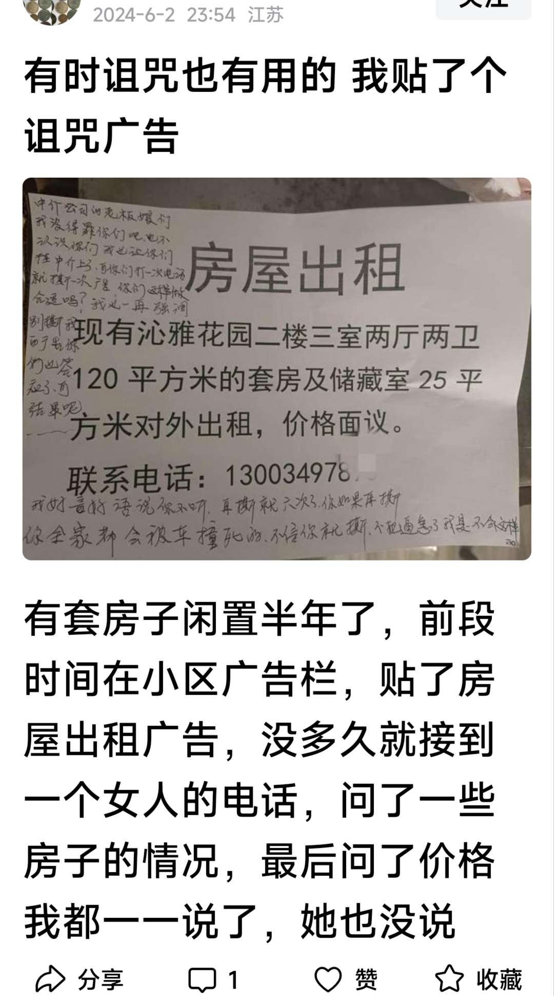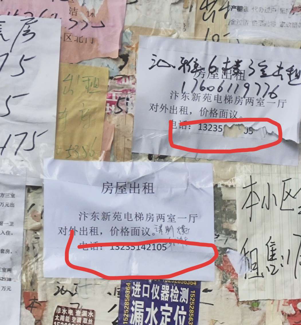 我当时就想她不会是把我贴的广告撕了吧!第二天就去广告栏看一下,结果还真被撕了,我又重新贴了一个又有人打电话又是中介的,说了同样的话我又同意了,也没多想过后就没消息了,我又去广告栏看看,结果租房广告又被撕了,再贴,当时有个女的也在她说是中介的,问我房子能不能挂到她的中介上我说可以的,我们一起离开的,她向南我向北,快到北门时我忽然闪了一下念头,她会不会返回去把我的广告撕了,不放心我就返回去看一下结果还真被撕了,干生气也没办法贴吧,