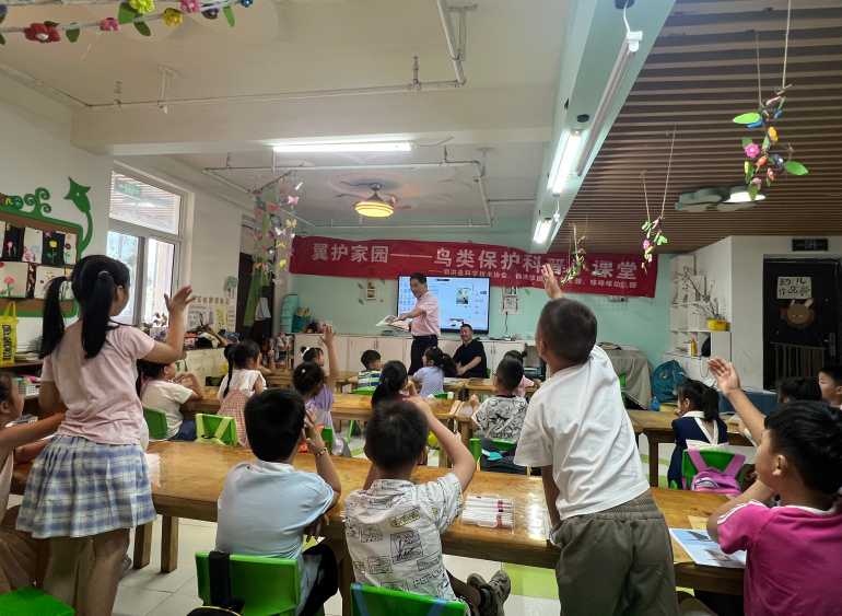 讲解过程中,霍主任特别注重互动性,巧妙设置了问答环节。“大家都知道什么鸟吗?”“你们有谁能说出我们身边的哪些鸟是保护动物”“我们能为保护鸟儿做些什么?”一个个贴近生活的问题,激发了孩子们的好奇心和参与热情。小朋友们踊跃举手,争相回答,分享自己对鸟类的观察和爱护鸟类的想法。这种寓教于乐的“科普+互动”模式,不仅传递了知识,更在孩子们心中点燃了关爱鸟类、守护家园的热情。