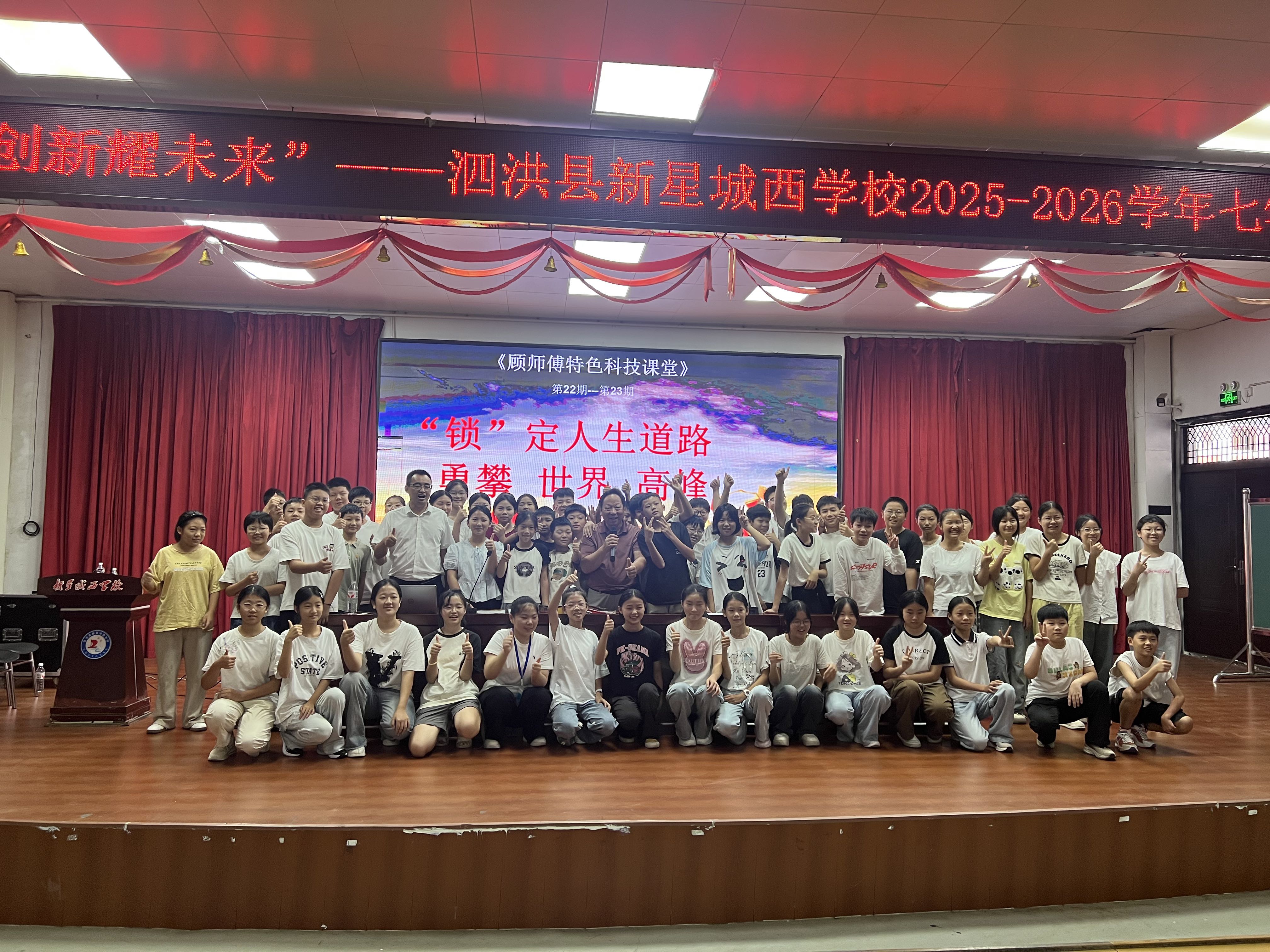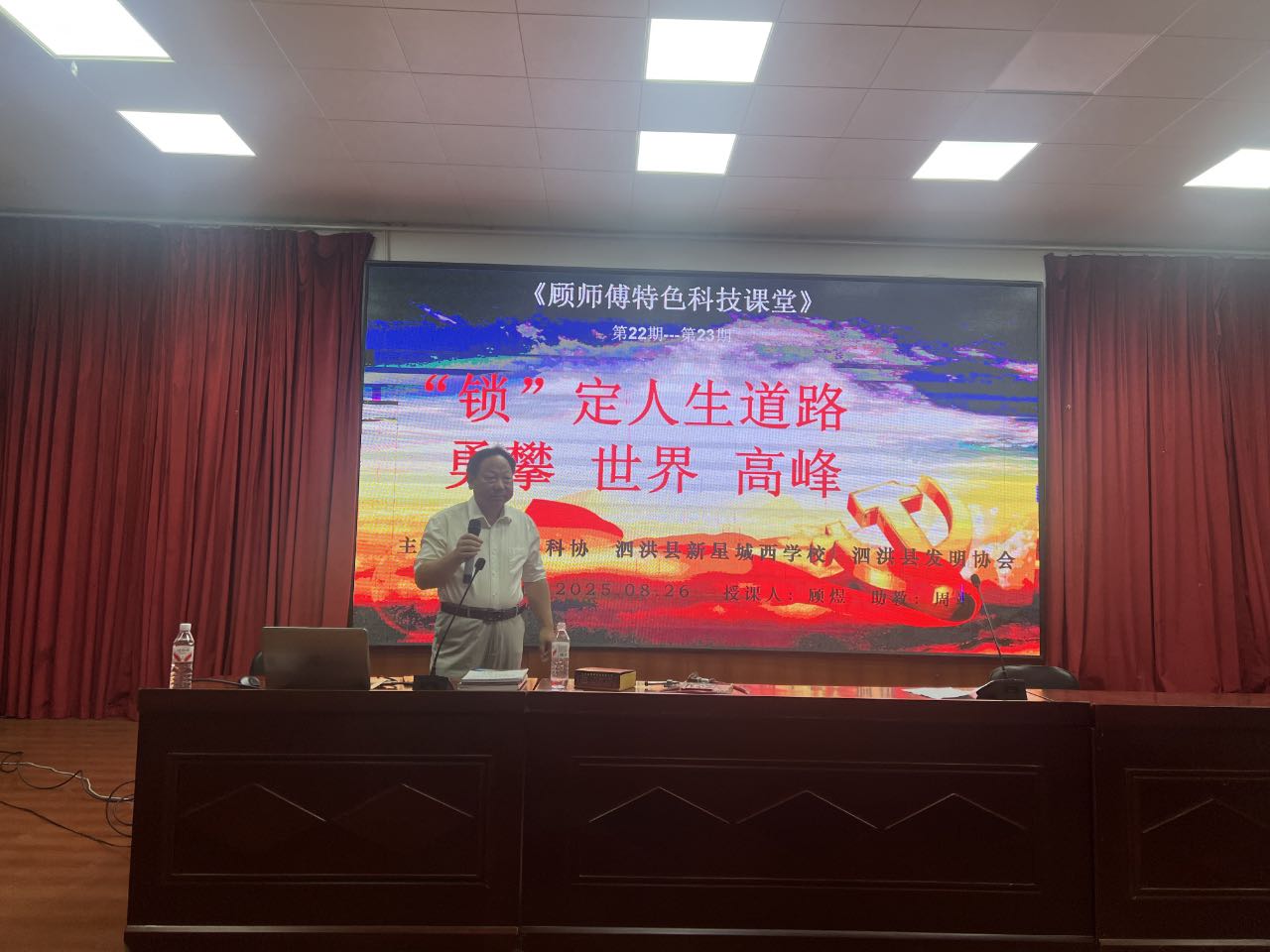 春风化雨润童心,科技筑梦正当时2025年8月26日上午,江苏省大工匠、泗洪县发明协会会长顾煜走进泗洪县新星城西学校,为学生们带来了一场别开生面的科技课堂——“锁”定人生道路 勇攀世界高峰。作为“顾师傅特色科技课堂”第二十二期活动,本次课程以“锁芯奥秘”为切入点,通过真实故事、科学实验与互动体验,在孩子们心中播撒下探索与创新的种子。