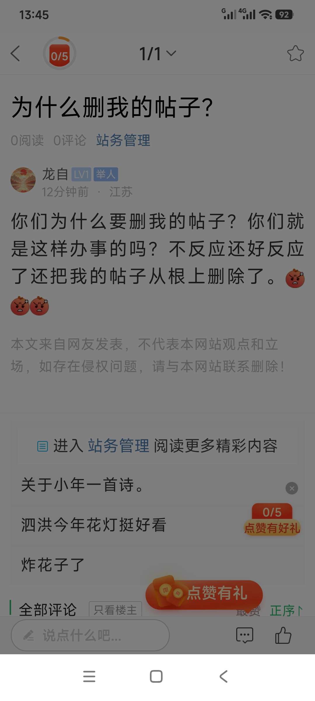 开始我只是象你们反应一下,我的帖子自己为什么看不到?结果不问还好,一问你们把我所有帖子从根彻底删光了。你们做事真是够绝的,还好你们没有抓人的权力,否则你们是什么事都能做出来的。你们为了利益真是不择手段。无理由删帖只能说明你们收人家的钱了。