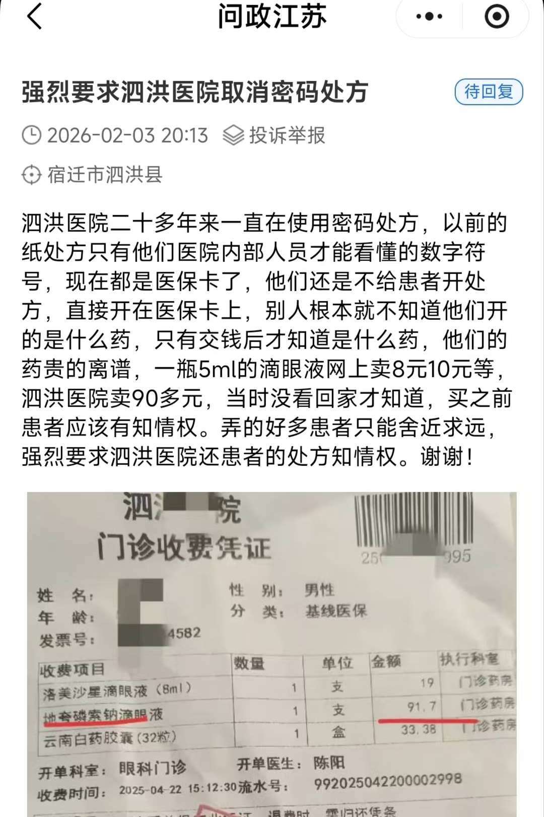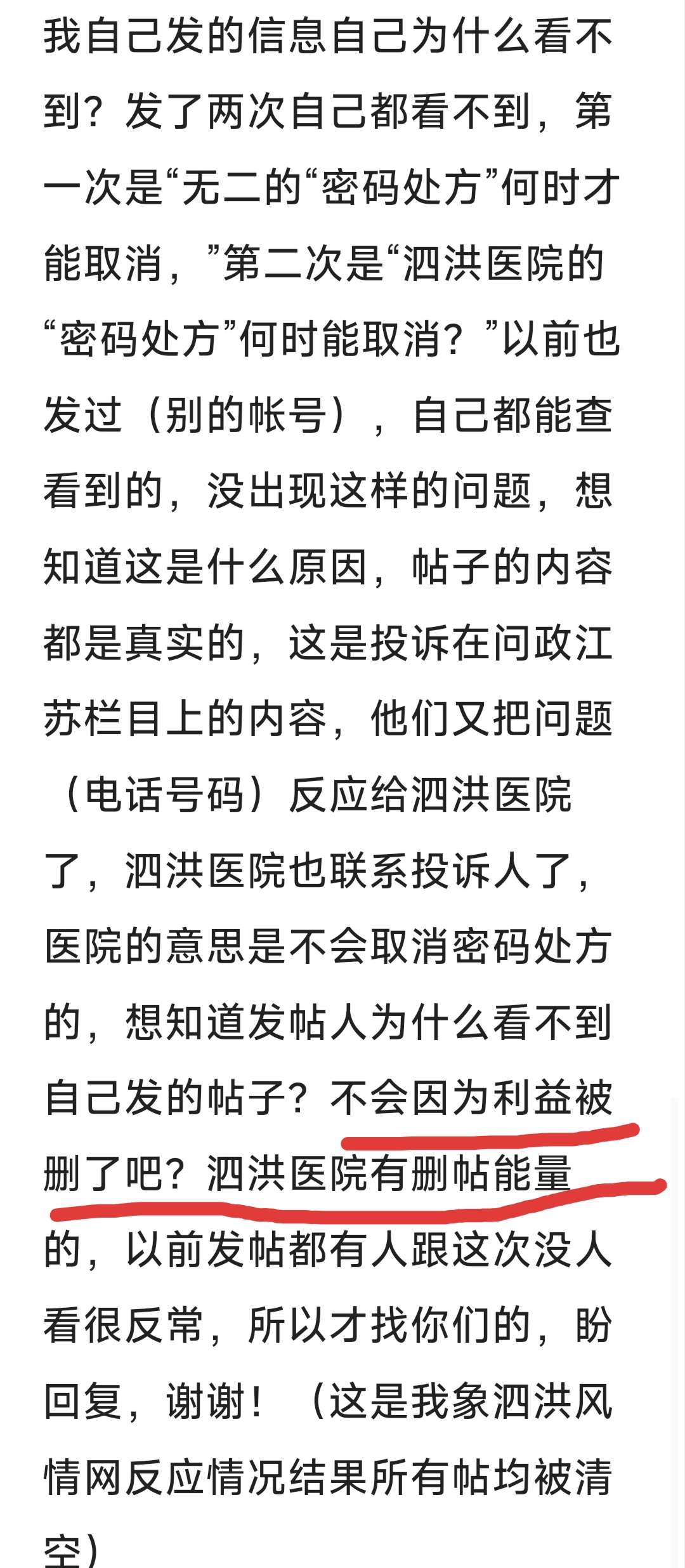 请问贵平台,我发的“无二的“密码处方何时才能取消”和“泗洪医院密码处方何时能取消”的帖子,有什么问题吗?还是违反什么规定了,请你们指出来,有什么责任我承担,如果没有你们为什么要删帖?你们究竟收了泗洪医院多少好处费?把我的帖子删了,