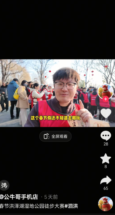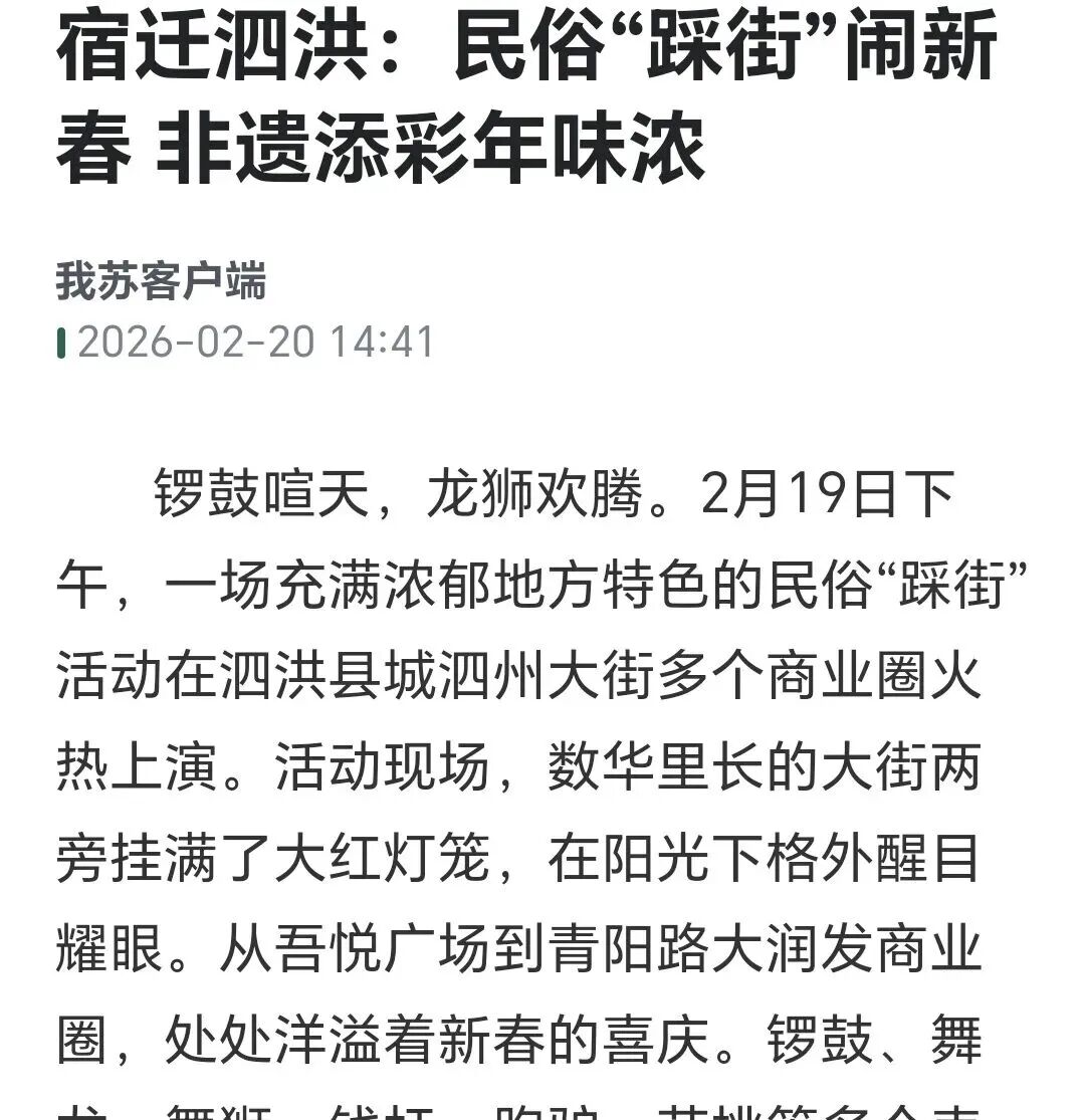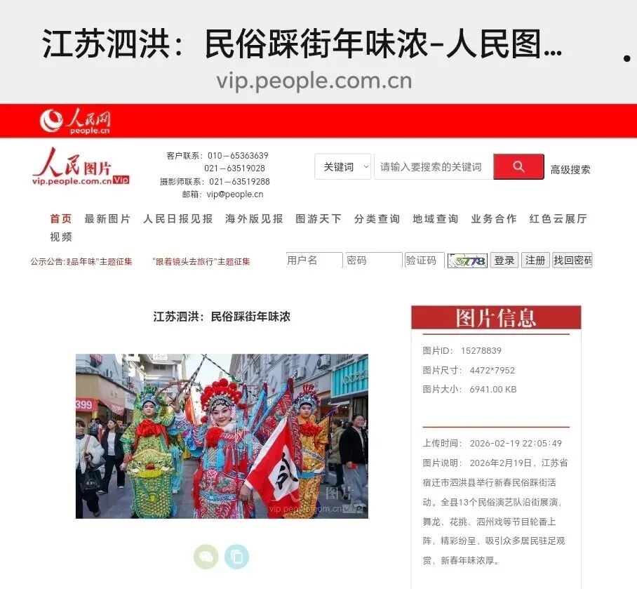 2026年春节,泗洪文旅亮点频现,获得国家、省、市、县媒体持续聚焦。 其中,CCTV-13《新闻直播间》《东方时空》 分别报道泗洪瑶沟官塘“村晚”、新春民俗“踩街”和湿地新春徒步游活动。 人民网、江苏卫视、江苏新闻、我苏网、荔枝新闻、宿迁发布、速新闻、泗洪发布等主流平台持续跟进,形成全方位宣传矩阵。 文旅宣传创新破圈,泗洪首部微短剧《一觉醒来!我和外婆做姐妹!》于2月18日和2月22日分别登陆江苏卫视和江苏国际频道春节档,成功实现从“小屏”话题出圈到“大屏”热播的华丽转场。 春节前夕泗洪县还邀请县内部分网红达人参与泗洪文旅宣传。春节期间,不少“泗洪文旅推广达人”积极宣传家乡。 洪泽湖湿地景区创新推出大型红色实景演艺《洪泽湖1942》,成为泗洪假期文旅新爆点,游人如织,好评如潮。